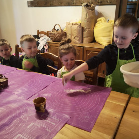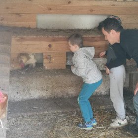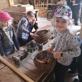Piekliśmy bułeczki w prawdziwym piecu, odwiedziliśmy owieczki, kózki, króliki, a także kury, którym podebraliśmy jajka. Braliśmy udział w zabawach ruchowych na świeżym powietrzu oraz w bawialni, a także ważyliśmy i sprzedawaliśmy warzywa. Na koniec wiejskiej przygody piekliśmy kiełbaski przy ognisku.