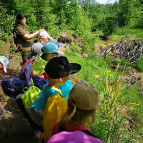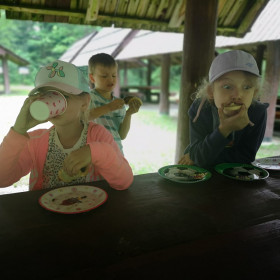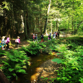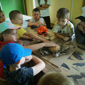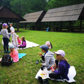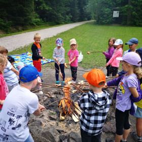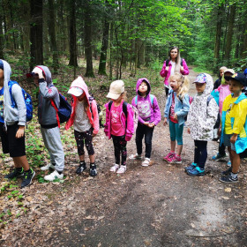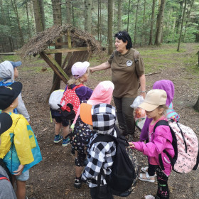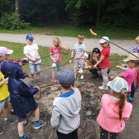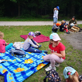 Po przyjeździe na miejsce, dzieci na początku uczestniczyły w zajęciach w salkach leśnych, a potem wszyscy ruszyli żółtym szlakiem w stronę lasu. Podczas wędrówki edukacyjną ścieżką przyrodniczą, dzieci miały możliwość poznać bliżej rośliny i zwierzęta żyjące w środowisku leśnym. Dowiedziały się m.in. co to jest wataha i lizawka, zobaczyły jak wygląda paśnik, spotkały po drodze żabę i wiele gatunków ptaków. Pani leśnik wyjaśniła im na czym polega jej praca oraz opowiedziała mnóstwo ciekawostek dotyczących zwyczajów mieszkańców lasu. Wszystkie dzieci dzielnie maszerowały i z uwagą słuchały wszystkich informacji. Na koniec było ognisko i zabawy na świeżym powietrzu. Dzieci jednomyślnie przyznały, że las jest wyjątkowo piękny i postanowiły wrócić tu jak najszybciej. Mają jedynie jedno marzenie- żeby nie było tam tyle komarów.