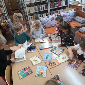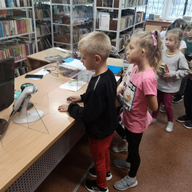 Następnie każde dziecko mogło samodzielnie wypożyczyć swoją pierwszą książkę z biblioteki szkolnej. Na pamiątkę tej wizyty dzieci otrzymały okolicznościowe zakładki do książek.