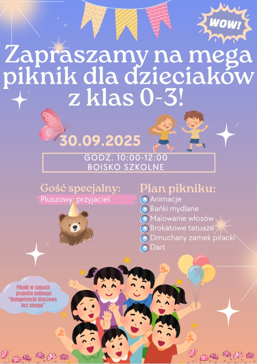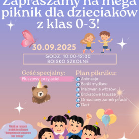 30.09.2025 r. zapraszamy wszystkie dzieci z klas 0-3 na wspaniały Piknik na Boisku szkolnym. Zaczynamy o godzinie 10:00.
