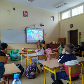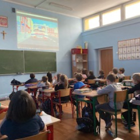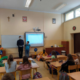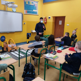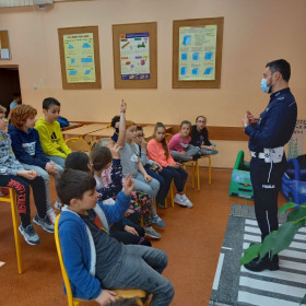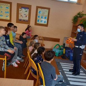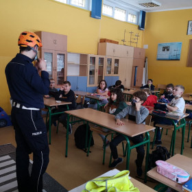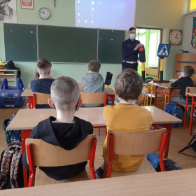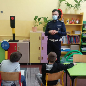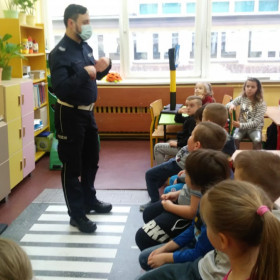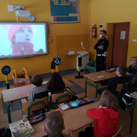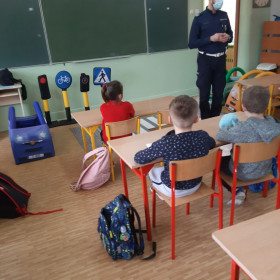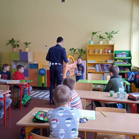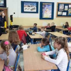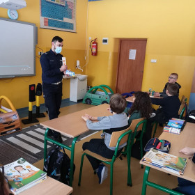 Pan policjant przeprowadził zajęcia o bezpieczeństwie w ruchu drogowym w oddziale przedszkolnym i klasach I-III. Przypomniał o obowiązku noszenia elementów odblaskowych, zademonstrował w jaki sposób bezpiecznie przechodzić przez jezdnię, a także omówił zasady obowiązujące podczas podróży samochodem osobowym.