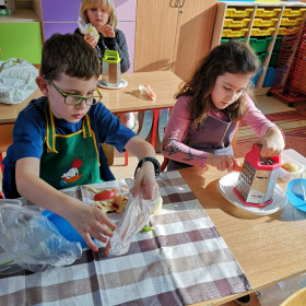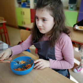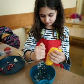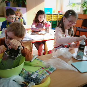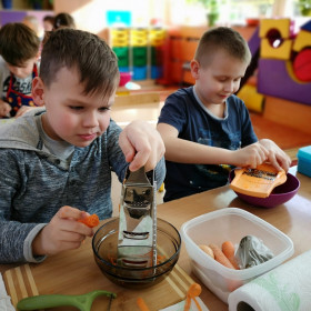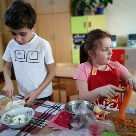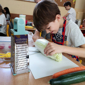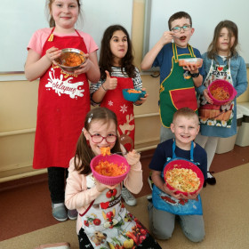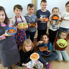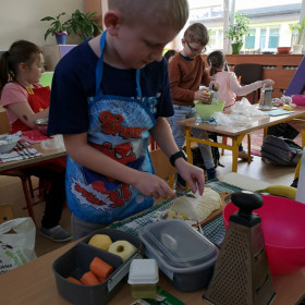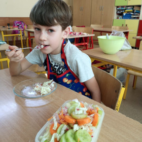Tematyka zajęć w klasie II a dotyczących zdrowego odżywiania się była inspiracją do wykorzystania zdobytej wiedzy w praktyce. Uczniowie bardzo dobrze przygotowali się do zajęć, bo przynieśli produkty potrzebne do zrobienia surówek, a także przybory niezbędne do ich wykonania. Przed przystąpieniem do pracy każdy uczeń starannie umył ręce, by z przyjemnością zabrać się do przygotowywania surówki. Dzieci samodzielnie kroiły warzywa i owoce przestrzegając zasad bezpieczeństwa przy posługiwaniu się przyborami kuchennymi. Podczas robienia surówek uczniowie przypomnieli, że gotowanie wymaga zachowania szczególnej higieny, bo nie tylko ręce, ale również warzywa należy myć przed obieraniem, krojeniem i spożywaniem.