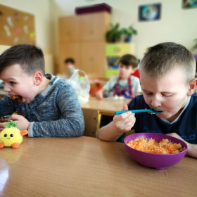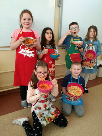 Kolejne zajęcia kulinarne nauczyły nas, że wiele smacznych i zdrowych surówek możemy przygotować sami. Bardzo lubimy takie zajęcia, bo dają nam wiele satysfakcji. Z wielkim apetytem zajadaliśmy przygotowane przez siebie zdrowe surówki.