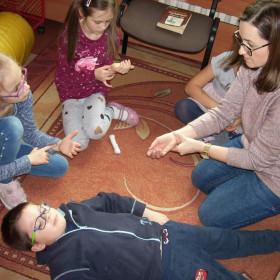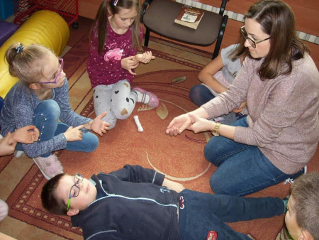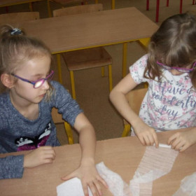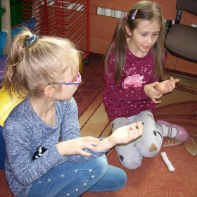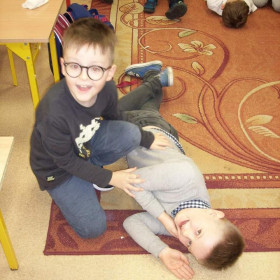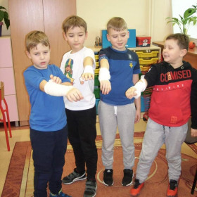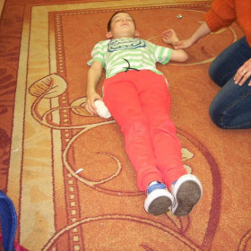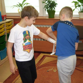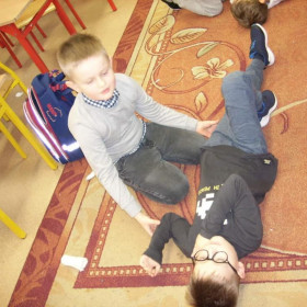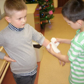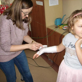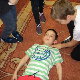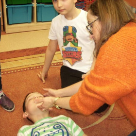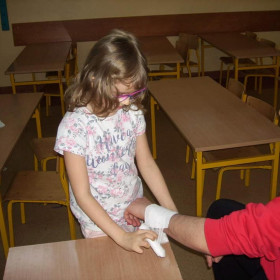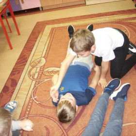 Po obejrzeniu filmu instruktażowego sprawdzano czynności życiowe i ćwiczono układanie poszkodowanego w pozycji bocznej ustalonej. Uczniowie nauczyli się również bandażowania, które wykonywali z niezwykłą starannością,