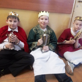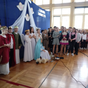 Następnie wszyscy spotkali się w sali gimnastycznej, gdzie w świątecznym klimacie oglądali Jasełka i wspólnie kolędowali.