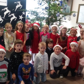 Powitaliśmy miłego gościa uśmiechami i muzycznym upominkiem, grupa "0"A zaśpiewała piosenkę "To Mikołaj, to Mikołaj...", natomiast grupa "0" B dedykowała Mikołajowi pastorałkę "Do stajenki...".
