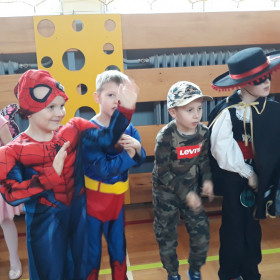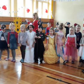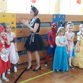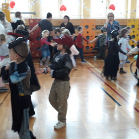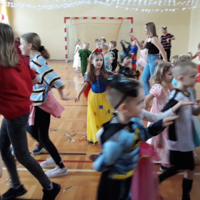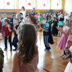 To naprawdę był bal na 100 par. Nasze karnawałowe harce prowadził animator, zapraszając nas do konkursów, zabaw i niesamowitych wygibasów. Sala gimnastyczna stała się w tym dniu piękną salą balową, pełną kolorowych ozdób, serpentyn i konfetti. A na balu spotkać można było postacie z bajek, księżniczki, rycerzy, policjantów, żołnierzy Spider - Menów, Batmanów...