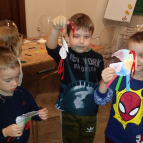 A później w ruch poszła nasza wyobraźnia razem z nożyczkami, flamastrami, kredkami, naklejkami, kawałkami bibuły i jeszcze inne materiałami. Robiliśmy ozdoby choinkowe /kolorowe papugi, które widzieliśmy na arrasach /dywanach wiszących na ścianach/, które oglądaliśmy podczas zwiedzania sal wystawowych muzeum.
