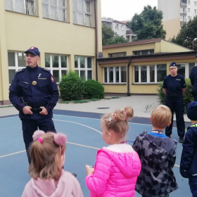 Spotkanie oddziału przedszkolnego 0 "A" z przedstawicielami Policji oraz oficerami Straży Ochrony Kolei