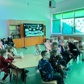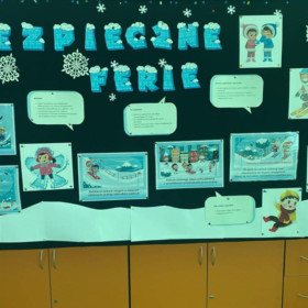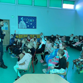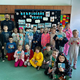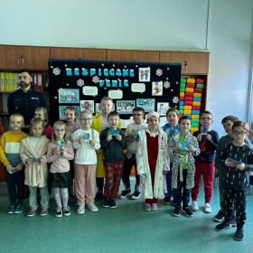 W ostatnim dniu przed feriami dzieci z oddziału przedszkolnego i klas pierwszych wzięły udział w spotkaniu z przedstawicielem policji. Zaproszony gość omówił zasady bezpieczeństwa podczas uprawiania sportów zimowych oraz gier i zabaw na świeżym powietrzu. Przypomniał zasady postępowania wobec nieznajomej osoby: „ Nie rozmawiaj...", „Nie ufaj...", „Nie wpuszczaj do domu...”, Dzieci mogły przypomnieć sobie, jak należy się zachować, jeśli staną się świadkami zdarzeń, w których zagrożone jest ludzkie życie oraz pod jakie numery należy dzwonić, aby uzyskać potrzebną pomoc. Ważnym elementem spotkania była rozmowa o przestrzeganiu zasad poruszania się po drogach, szczególnie po zmroku, kiedy niezbędne stają się elementy odblaskowe. Na zakończenie spotkania dzieci zrobiły sobie pamiątkowe zdjęcie z Panem Policjantem, który życzył wszystkim wspaniałych, bezpiecznych ferii.