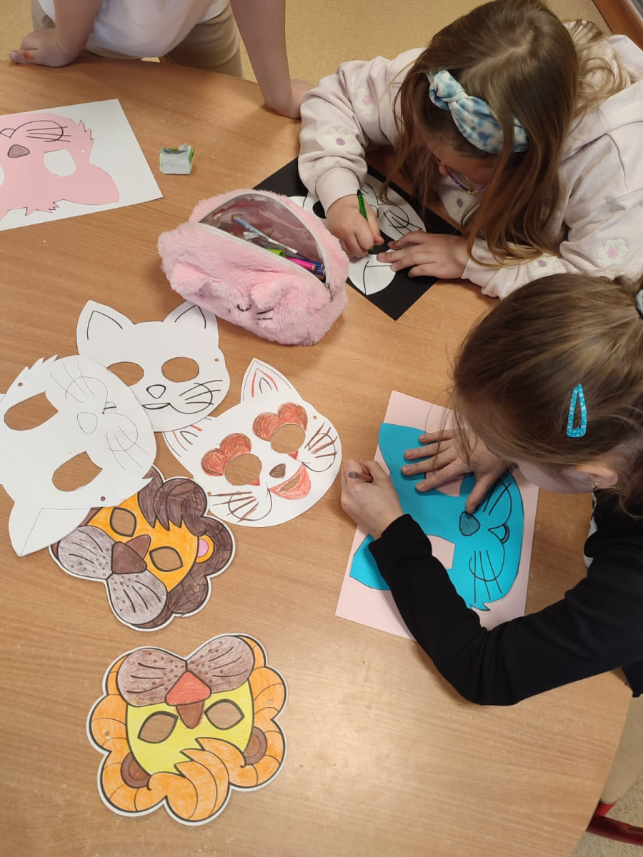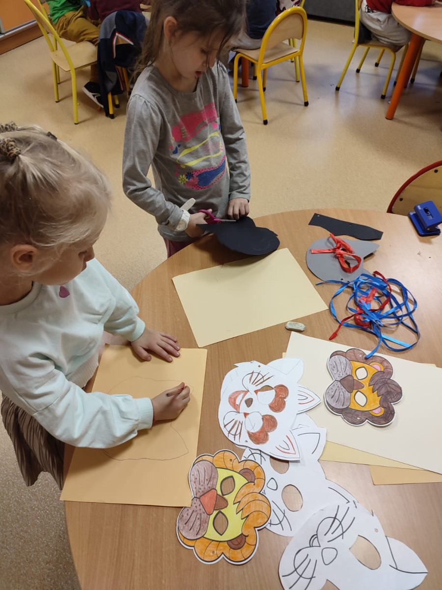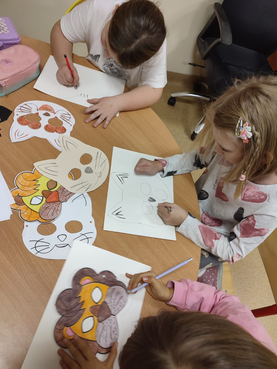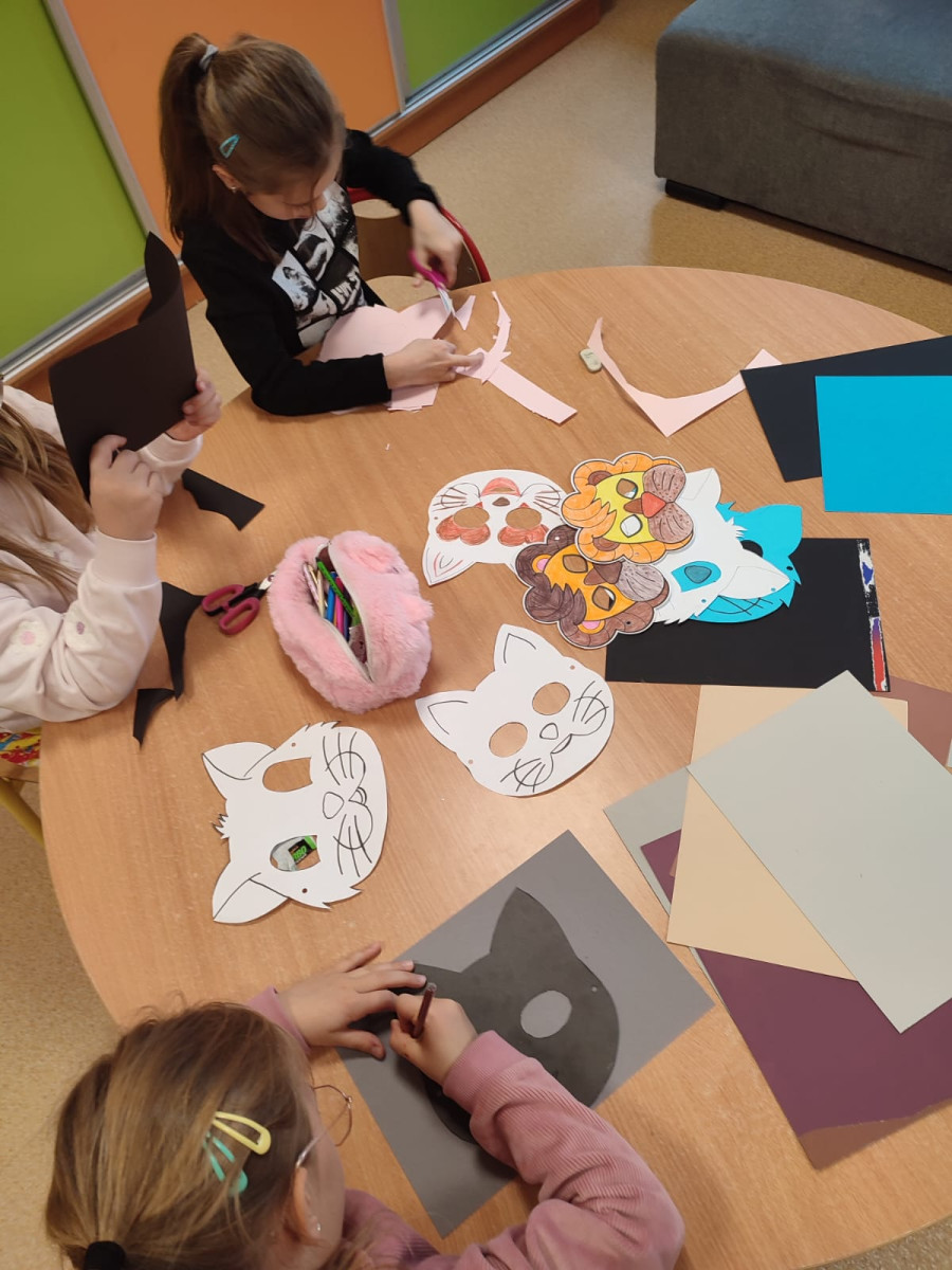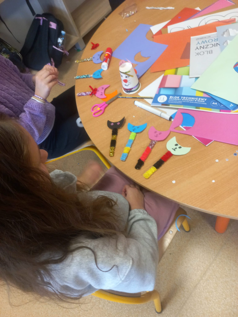 W części plastycznej, dzieci wykonały tematyczne prace artystyczne, tworząc sylwetki czarnych kotów, maski oraz ozdoby inspirowane kocimi motywami. Zajęciom towarzyszyła radosna atmosfera i duża dawka kreatywności.