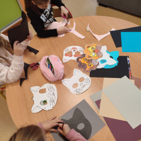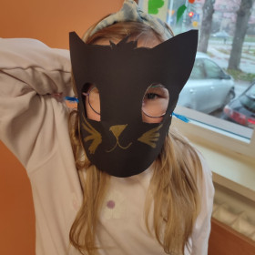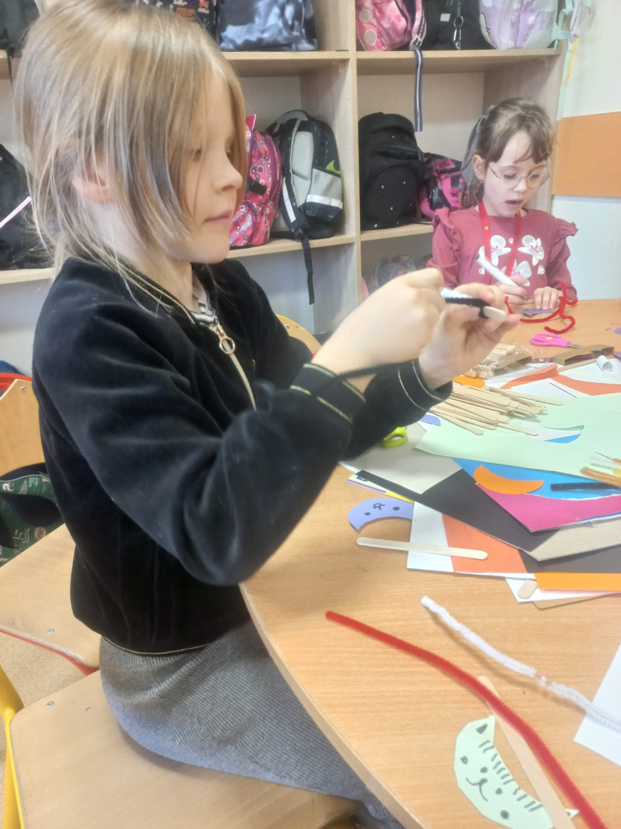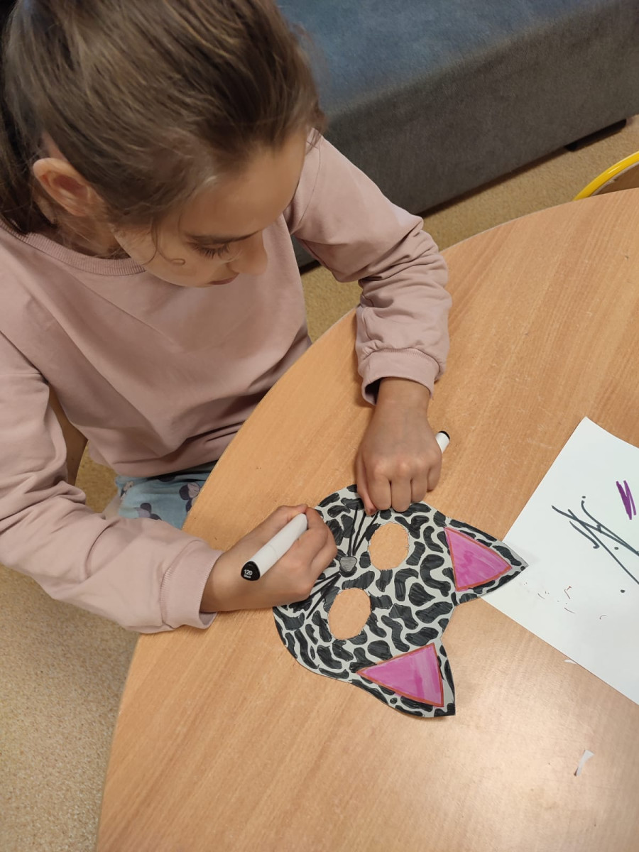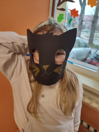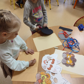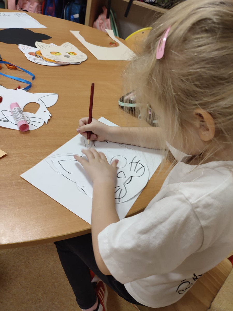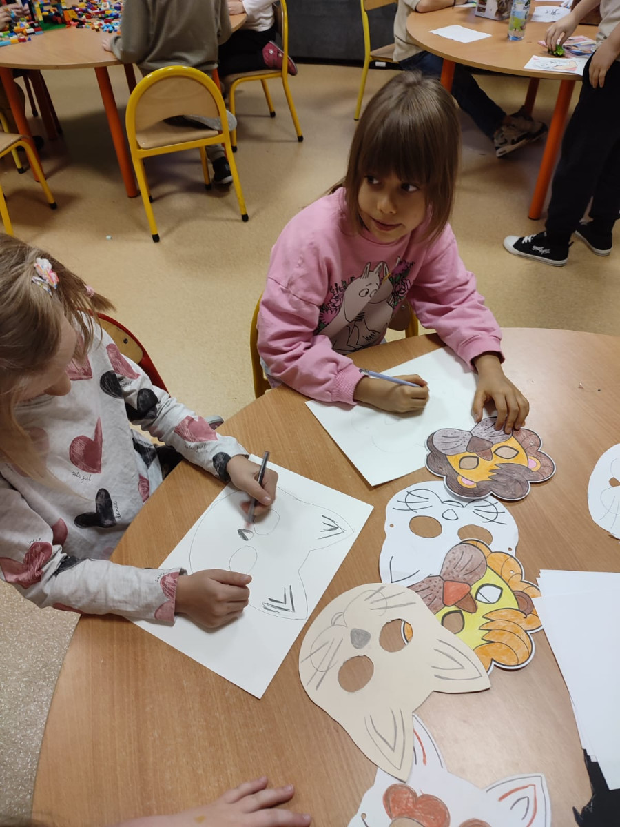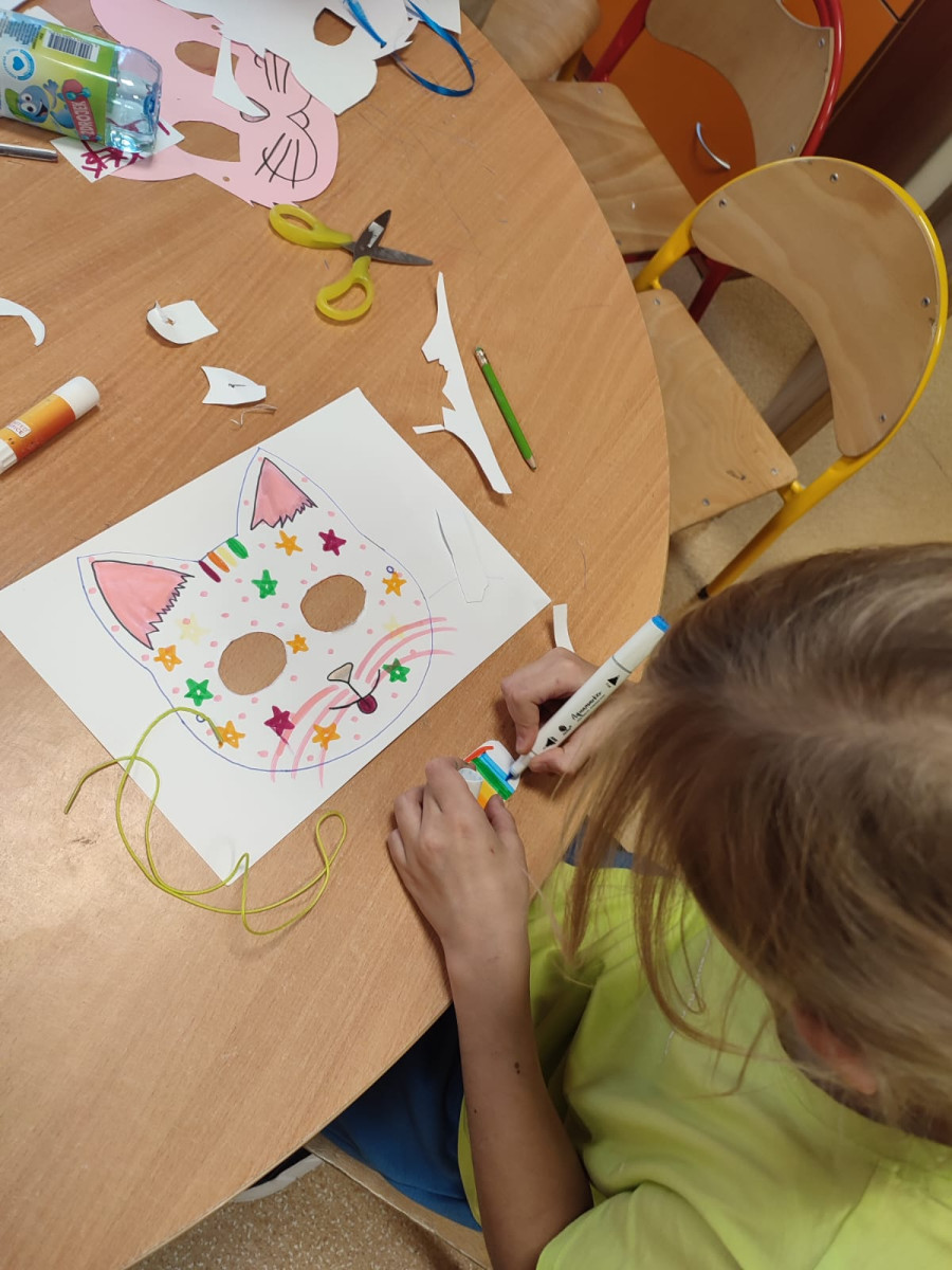 W części plastycznej, dzieci wykonały tematyczne prace artystyczne, tworząc sylwetki czarnych kotów, maski oraz ozdoby inspirowane kocimi motywami. Zajęciom towarzyszyła radosna atmosfera i duża dawka kreatywności.