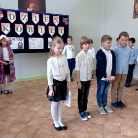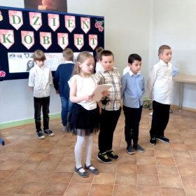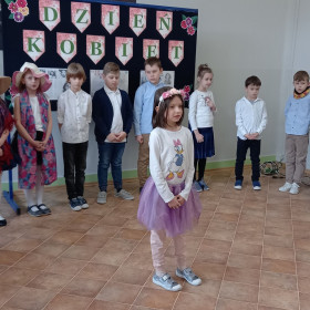 W ten wyjątkowy dzień odbył się występ przygotowany przez Świetlicowe Koło Teatralne oraz uczniów klasy 2c. Dzieci ze szczególnym zaangażowaniem starali się, aby Dzień Kobiet uczynić wyjątkowym i miłym. Radosna atmosfera panowała już od samego rana. Piosenki oraz elementy tańca urozmaicały występ. Wszystkie zgromadzone Panie otrzymały życzenia, piękne laurki oraz tulipany.