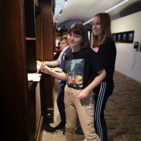 Kolejnym punktem programu był edukujący spacer po Kielcach, podczas którego wypełnialiśmy podane nam karty pracy, zbierając przy tym informacje. Wraz z świetnym oprowadzającym pooglądaliśmy przeróżne pomniki, poznając ich historie oraz znaczenia.Kolejnym i ostatnim punktem było Muzeum Lat Szkolnych Stefana Żeromskiego, gdzie cofnęliśmy się w czasie, poznaliśmy jego historię, usłyszeliśmy kilka ciekawostek, mogliśmy poczuć się jak za dawnych lat zasiadając w szkolnych ławkach oraz poznając kary stosowane w tamtych czasach.