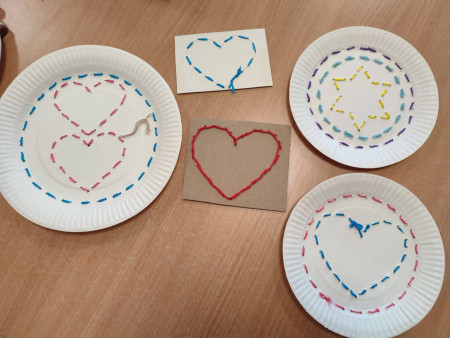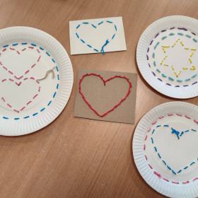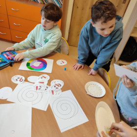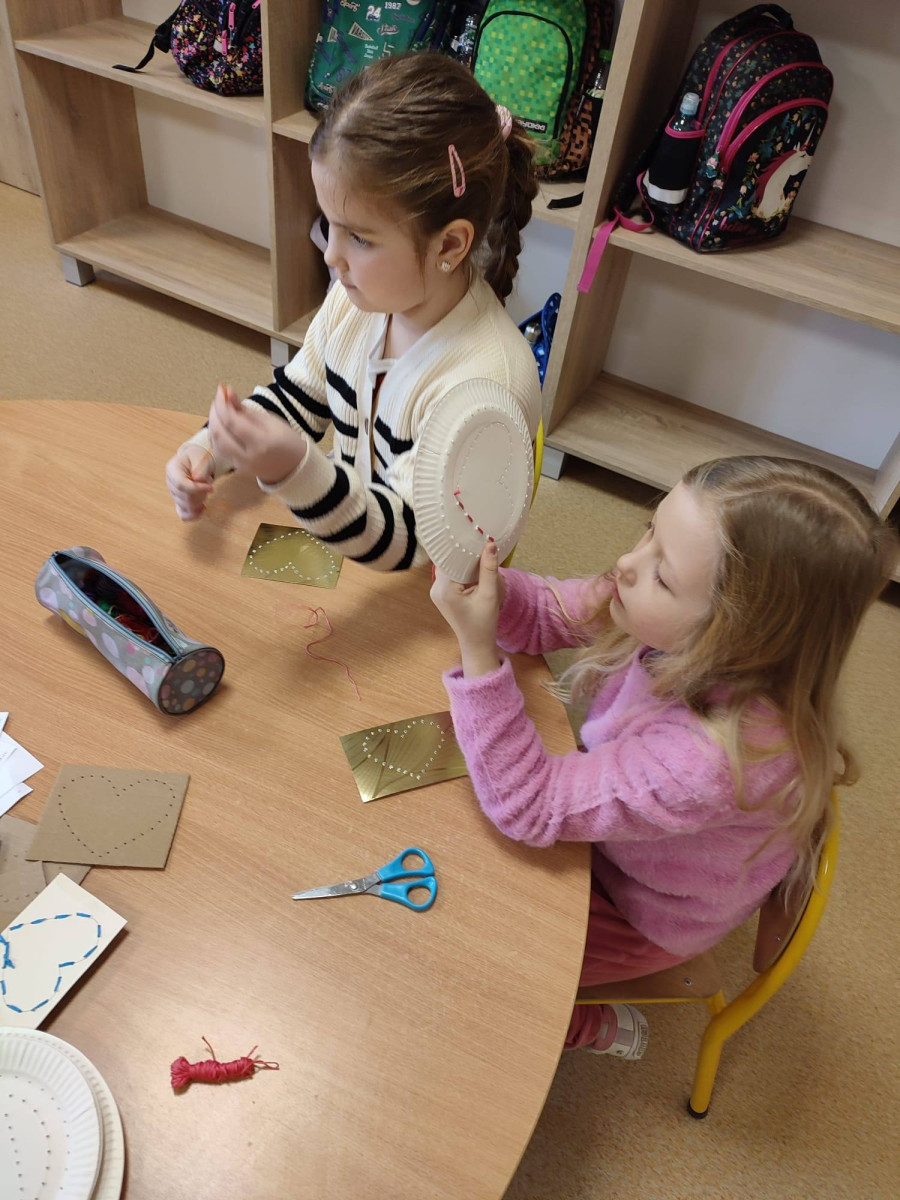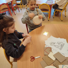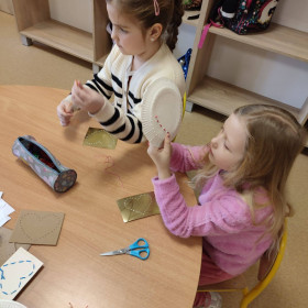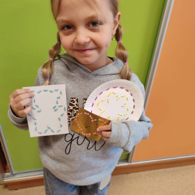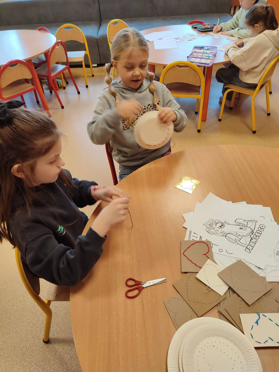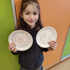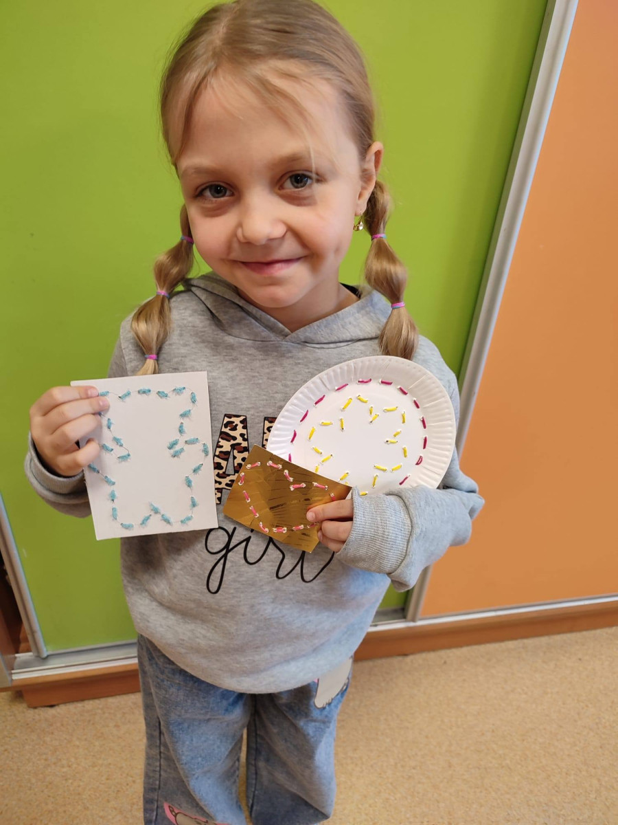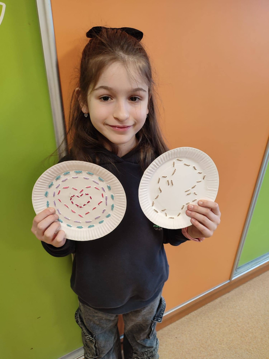 Dzieci spróbowały swoich sił w wyszywaniu na papierowych talerzykach. Z pozoru zwykły talerzyk zamienił się w piękne, misternie zdobione wzory. Praca wymagała skupienia, precyzji i kreatywności, a efekty zachwyciły wszystkich.