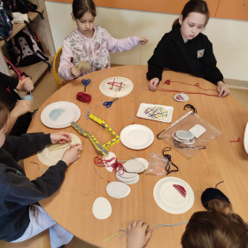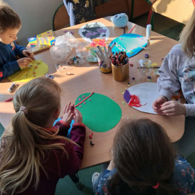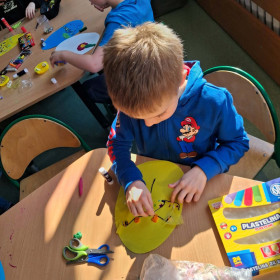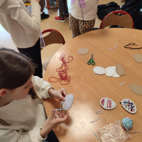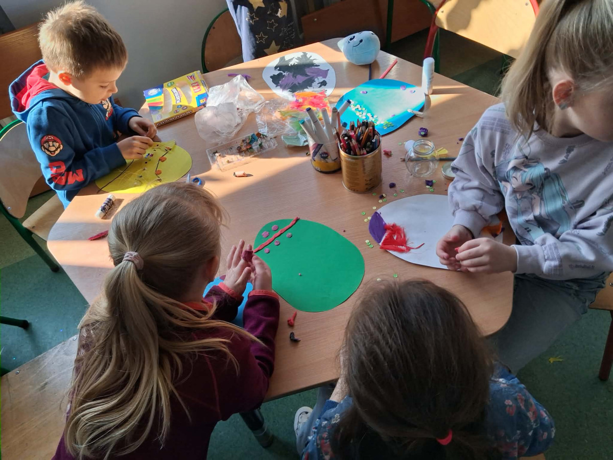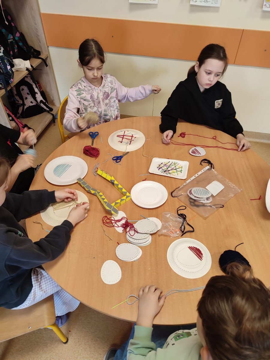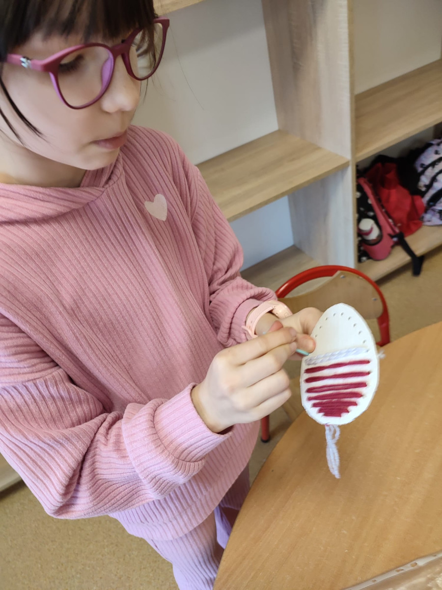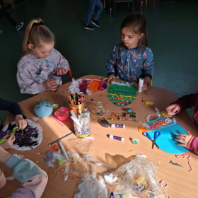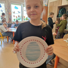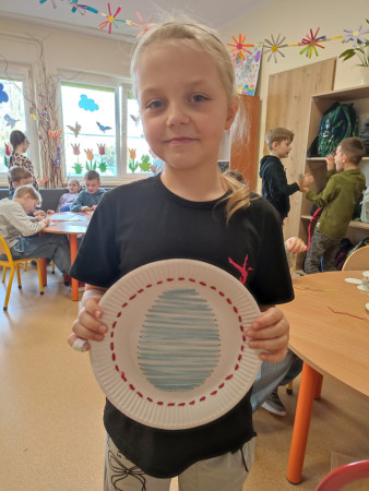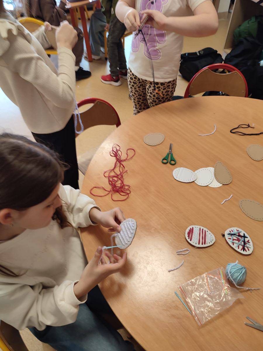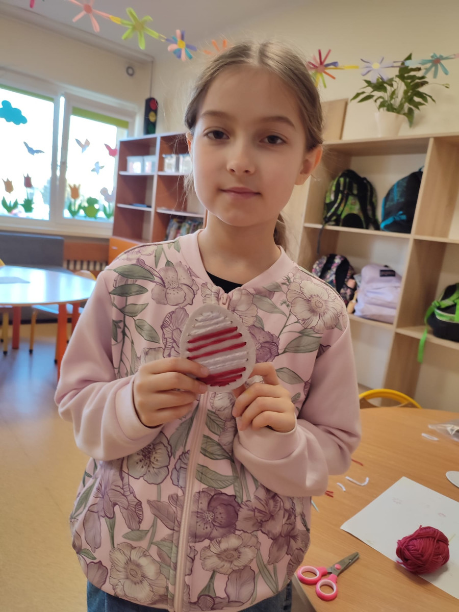 Dzieci z zaangażowaniem tworzą prawdziwe cuda inspirowane tradycją pisanek. Powstają u nas pisanki XXL, które zachwycają rozmiarem i pomysłowością, a także pisanki wyszywane, wymagające cierpliwości i precyzji – efekty są naprawdę imponujące!