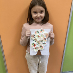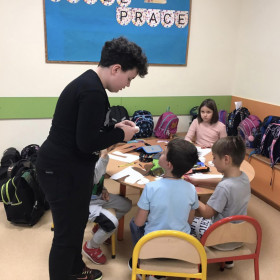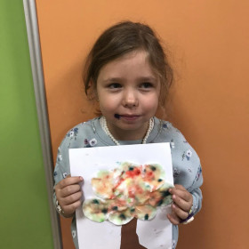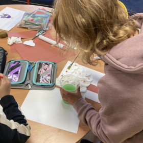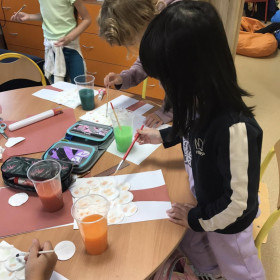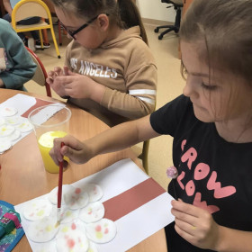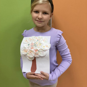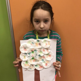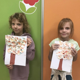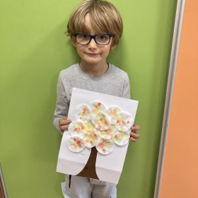 Dziś z pomocą wolontariuszy z klasy 6a tworzyliśmy pracę plastyczną: jesienne drzewa.
