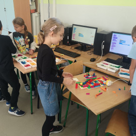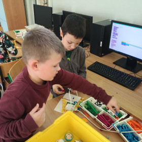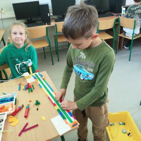 Zajęcia z robotyki w starszych klasach są jeszcze bardziej ciekawe. Uczniowie nie tylko budują wg. dostępnych instrukcji, ale sami tworzą swoje projekty i je programują. Nowe możliwości dał im zaawansowany zestaw klocków LEGO Prime. Uczniowie stworzyli z niego bardzo ciekawe pojazdy i urządzali nimi prawdziwe wyścigi.